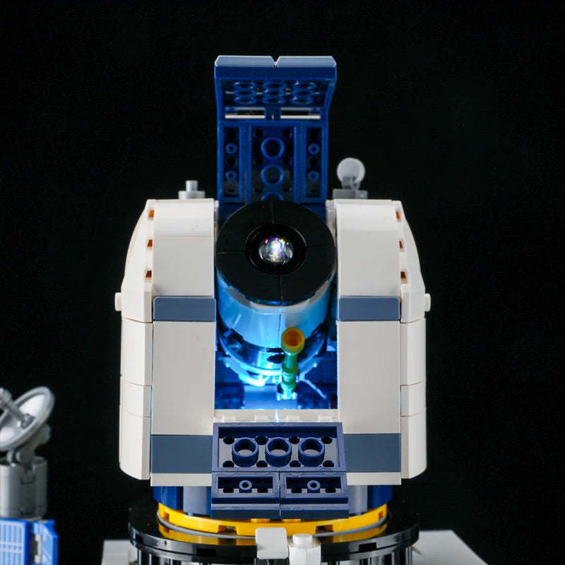1. The top observatory rotates 360° to reveal an optical telescope. The telescope extends and adjusts vertically.